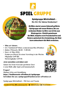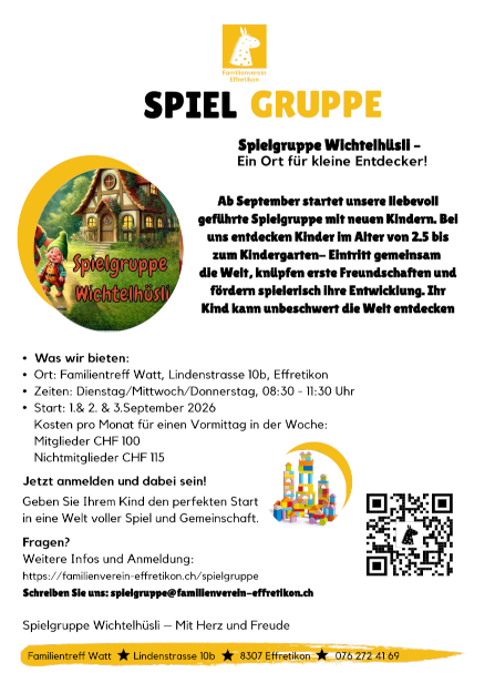 Anmeldungen für das Spielgruppenjahr, das im September beginnt, werden nun entgegen genommen. Ausserdem gibt es noch freie Plätze für den Mittwochmorgen, startend im März.